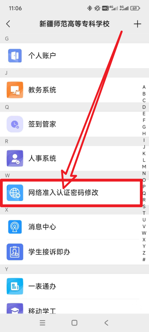 访问路径:“微信APP-通讯录-我的企业及企业联系人-“新疆师范高等专科大发在线登录”(校徽右下角带认证标识)-网络准入认证密码修改”。
