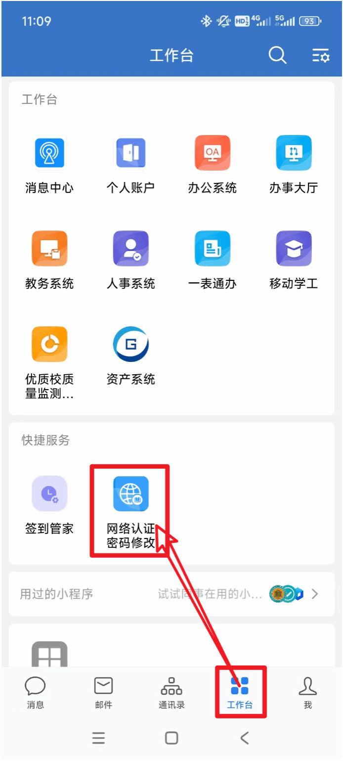 访问路径:“企业微信APP-工作台-快捷服务-网络准入认证密码修改”。