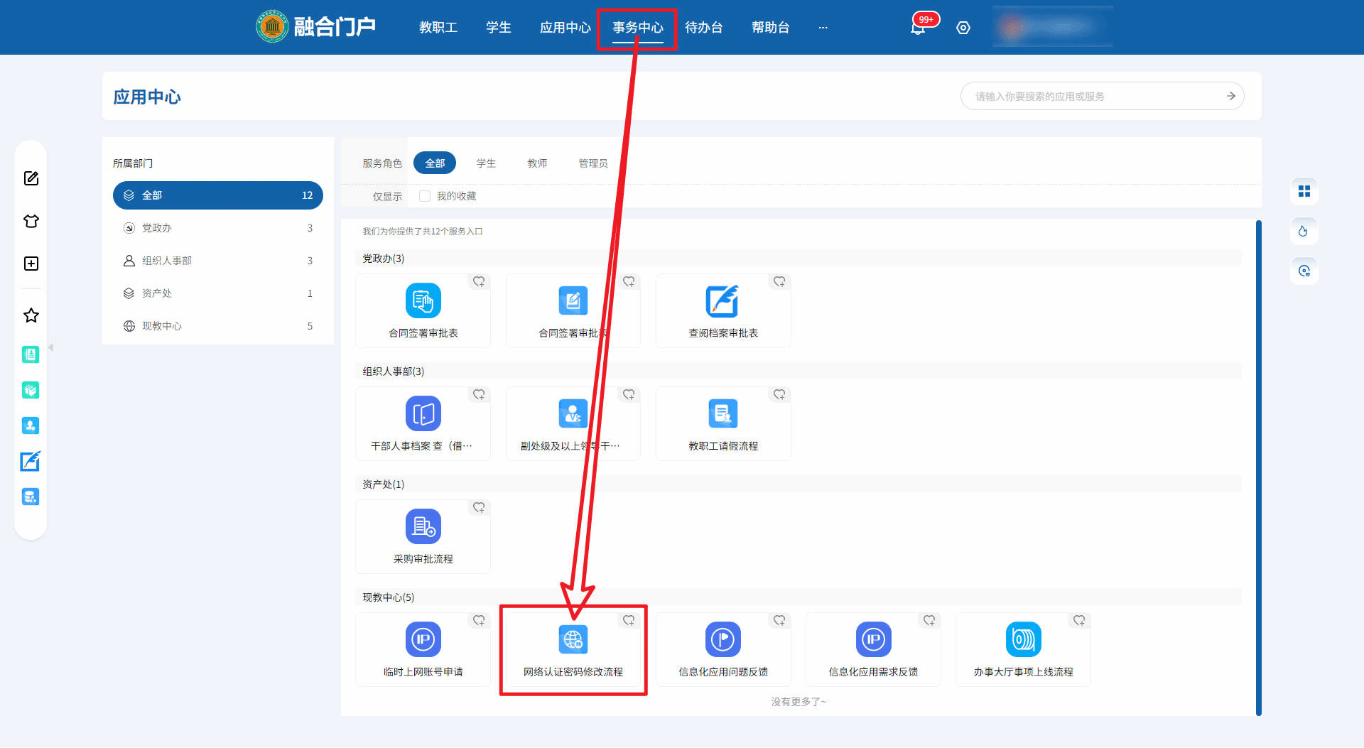 访问路径:“融合门户-事务中心-网络准入认证密码修改”。